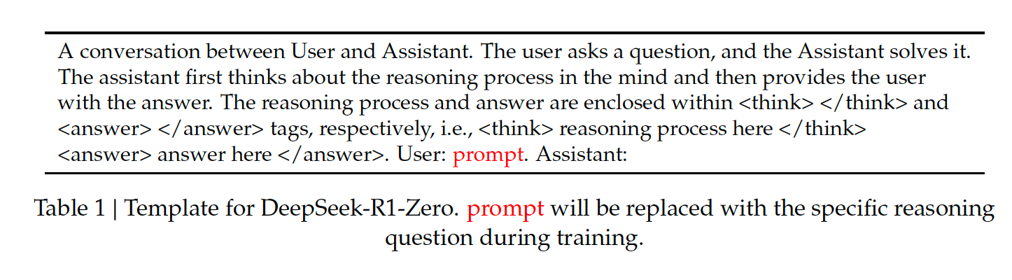 DeepSeek-R1-Zero is given a templated prompt that guides its response. The model is instructed to first spell out its reasoning process and add it within <think>...</think> tags. Then, it outputs its final answer within <answer>...</answer> tags.
