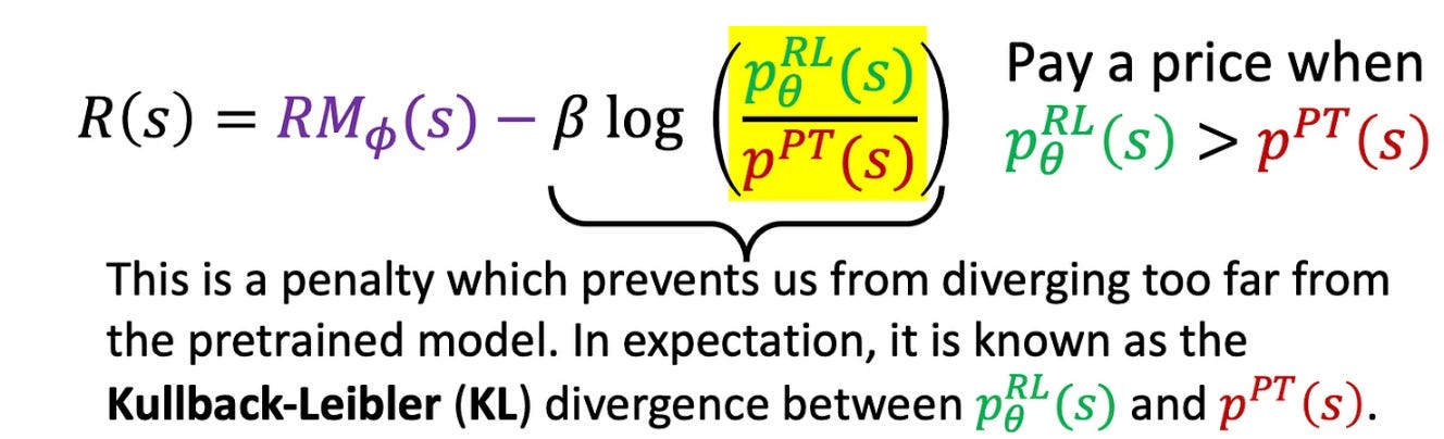 R_t: The return (reward) obtained from the generated response (a_t). The reward is usually obtained by training a reward model or by using a deterministic reward (e.g., a python interpreter for the generated code to assess correctness or ground truth answer for math questions). The KL terms ensures the policy doesn’t learn to produce outputs that are too different from those that the reward model has seen during training.