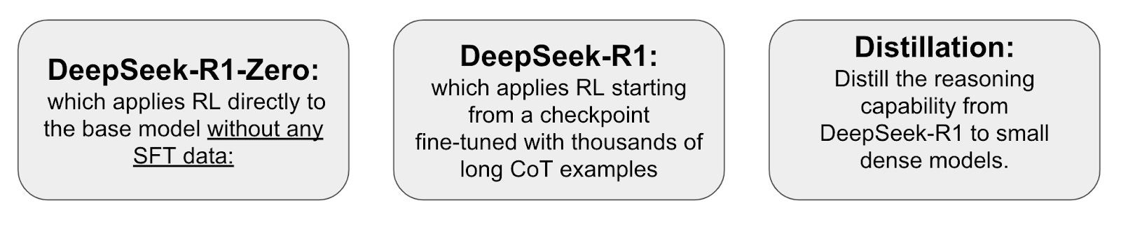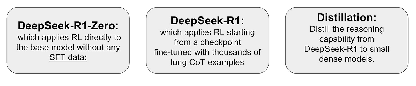 There are 3 types of models: DeepSeek-R1-Zero, DeepSeek- R1 and a series of distilled models.