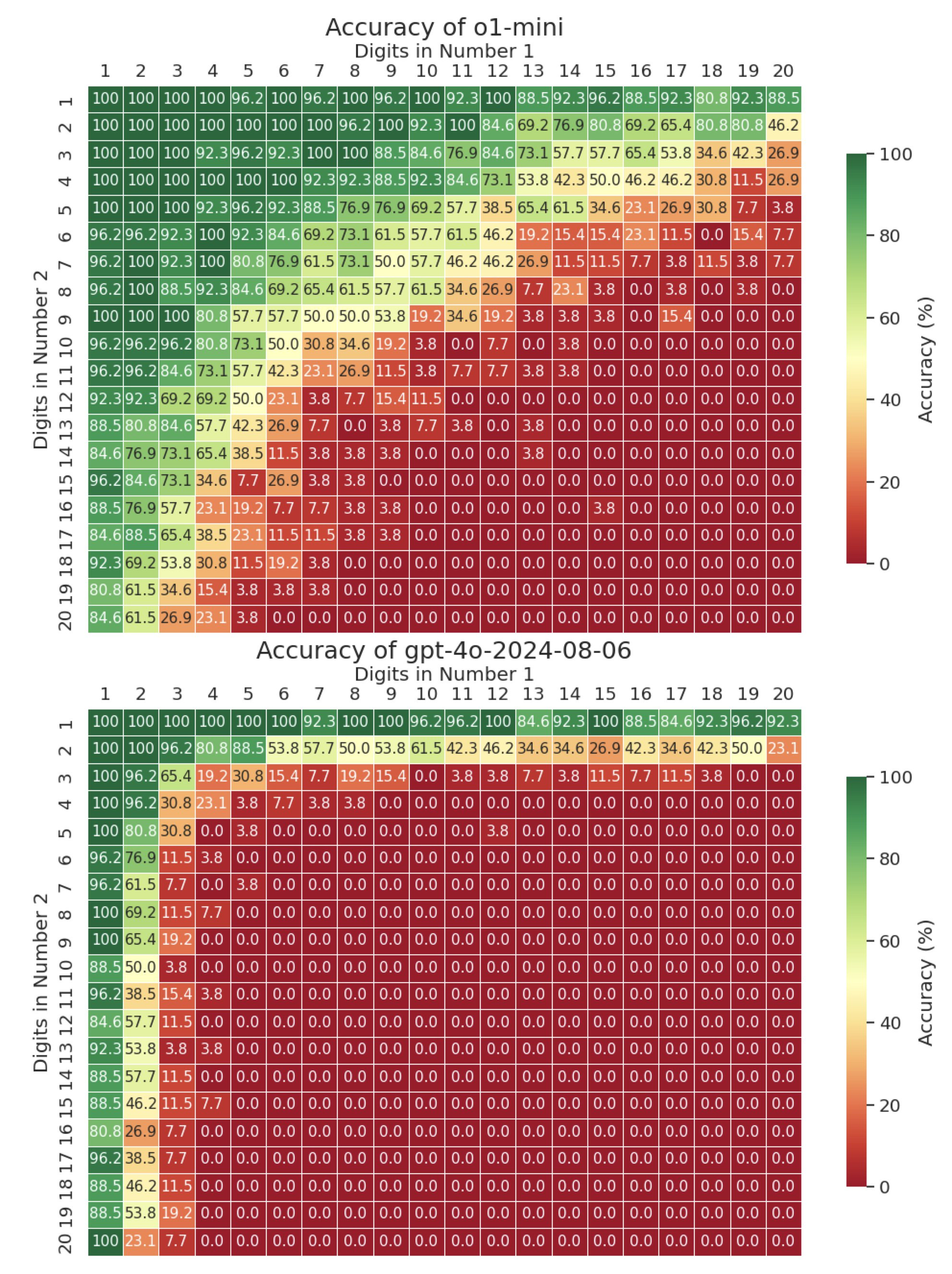Yuntian Deng tested “o1-mini” on up to 20x20 multiplication—it solves up to 9x9 multiplication with decent accuracy, while gpt-4o struggles beyond 4x4. GPT-4o was probably was not trained with the same amount of CoT trajectories and thus the lower performance.
