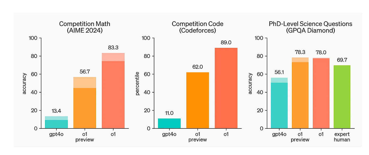 OpenAI hasn’t yet released the “o1” model, it only released the “o1-preview” model probably for infrastructure reasons related to serving it to millions of users, or perhaps because it's not as safe as they want it to be. However, we can see the gap between “GPT4o” and “o1” models. There's even a gap between humans and these models on PhD-level questions.