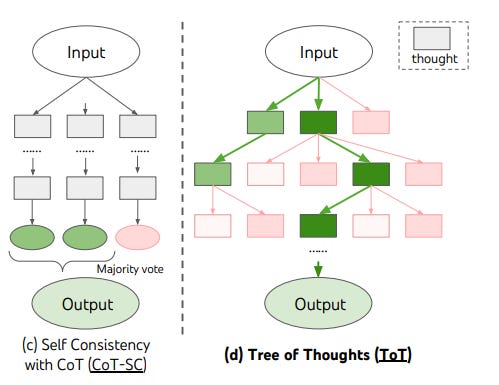 (Yao et al, 2023) introduced this approach last year. It uses LLM self-feedback: sampling one thought at a time leading to the solution, then self-evaluating by asking the model whether the generated step is likely correct or not. If deemed incorrect, the model won't follow that path further. By rating multiple future reasoning steps before proceeding, the model has opportunities to identify and correct errors. This aligns with many key successes in deep reinforcement learning, such as AlphaGo. The process involves complex decoding algorithms that balance exploration of different thought paths with exploitation of promising directions. OpenAI, at least during training, has a mechanism to adjust the amount of compute used through search depth, width, or heuristic calculation (scoring the nodes of search).