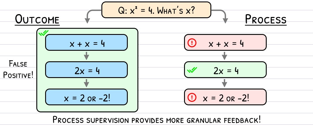 Scoring using Process Reward Models (PRMs) involves verifying every step individually rather than the entire sample. This method is more effective than both outcome reward models (which score only the final solution and not step-by-step) and majority voting when searching over a large number of model-generated solutions. PRMs provide a richer signal, because it specifies both how many of the first steps were correct and the precise location of any incorrect steps. However, there is no simple way to automate process supervision; it relies on human data labelers to provide process supervision by labeling the correctness of each step in model-generated solutions. To reduce dependence on costly human feedback, large-scale models are used to supervise small-scale model training. o1 likely used PRMs to score the generated chain of thoughts both during training and at inference time. The image below from @prnvrdy provides a nice illustration.
